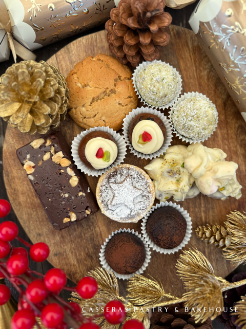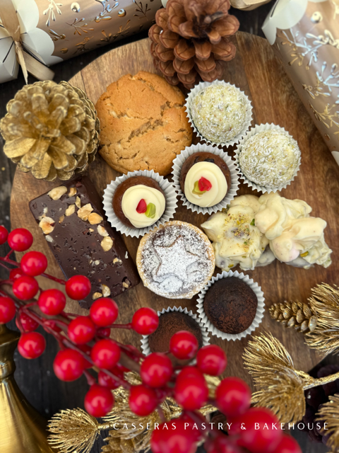 2 x rum balls, 2 x mini puds , 2x snow truffles, 1 x hazelnut fudge bar, white rocky road, 1x fruit mince tart, gingerbread cookie $39